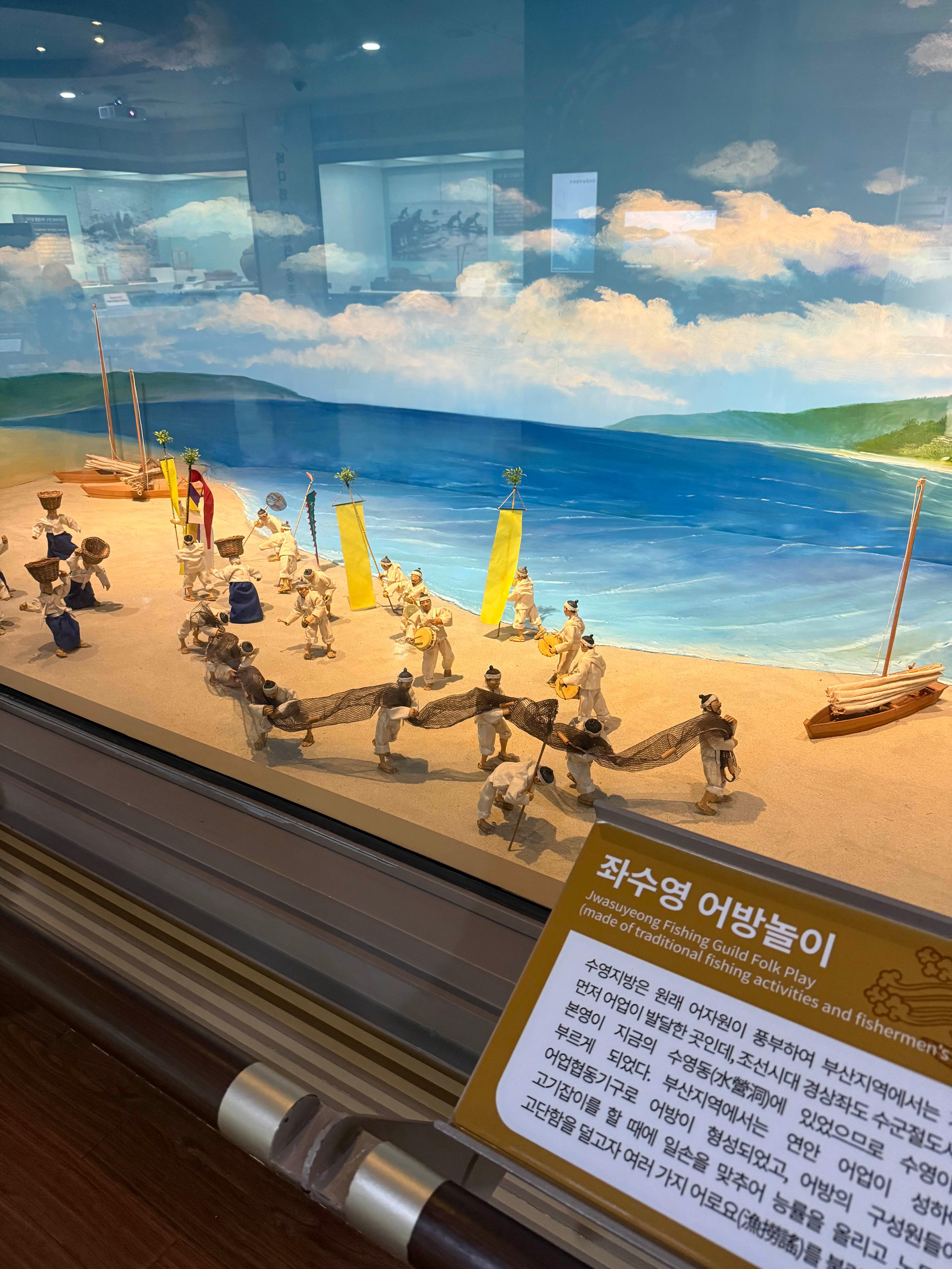 입장과 동시에 시대별 어업 방식을 보여주는 전시들이 시선을 사로잡는데 옛날 고기잡이에 쓰였던 ‘육소장망(陸巢張網)’이나 ‘통발’ 같은 도구들이 실물 또는 축소 모형으로 전시되어 있고, 좌수영 어방놀이와 같은 전통 어민 놀이 문화도 디오라마로 생생하게 소개하고 있다.