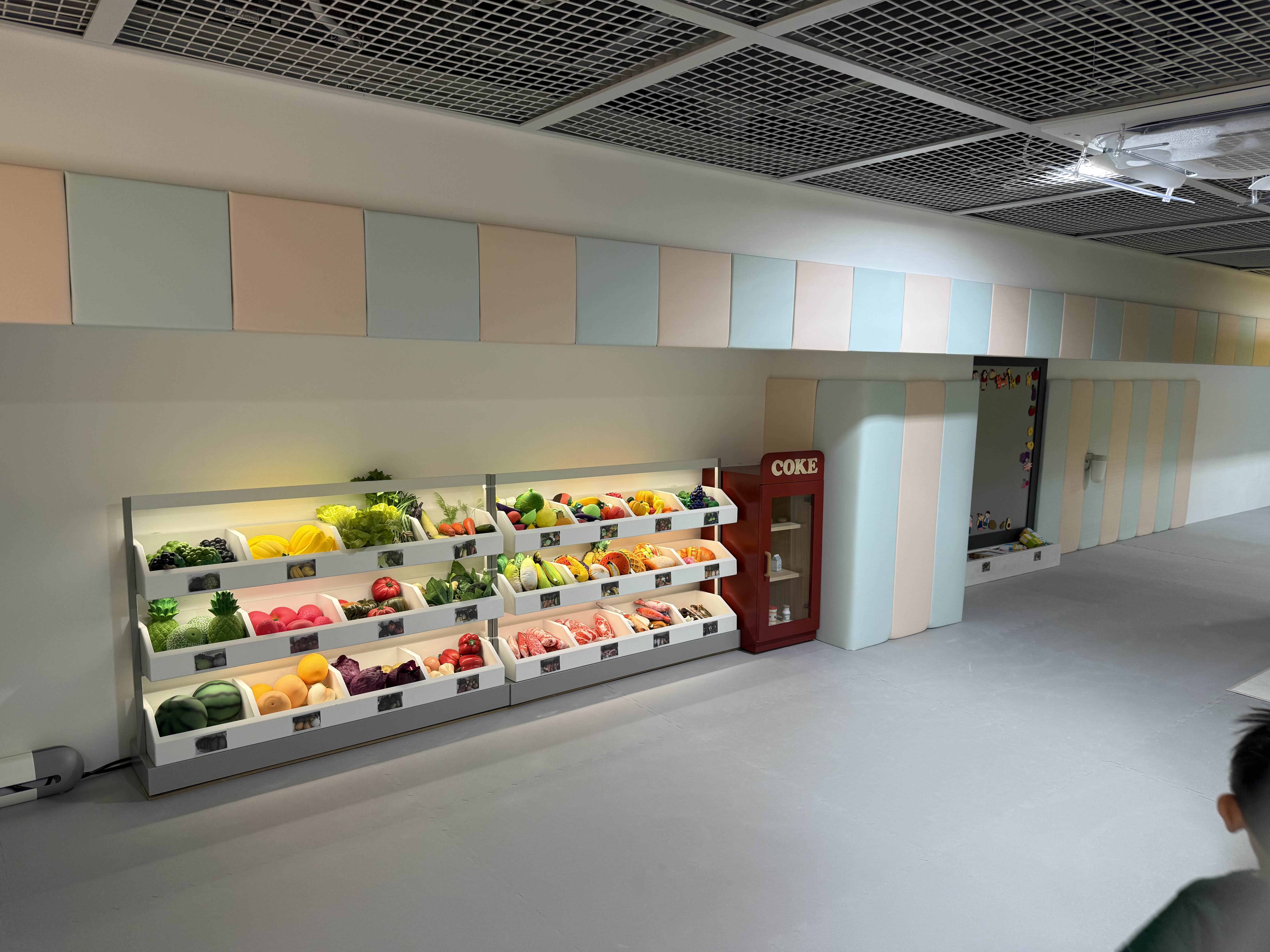 여아들의 인기 공간은 바로 주방놀이! 싱크대, 조리도구, 냄비, 모형 식재료까지 아기자기하게 잘 갖춰져 있어 셰프도 됐다가 마트직원도 됐다가 바리스타도 될수있다. 거리가 가까워 마트에서 장보고 주방 놀이까지 할수있는게 좋았다.
